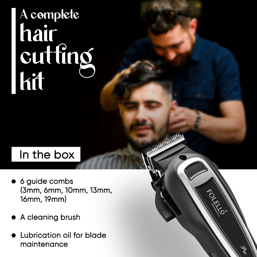 The FOLELLO Pro 10 Hair Trimmer comes complete with essential accessories to enhance your grooming experience. Includes 6 guide combs (3mm, 6mm, 10mm, 13mm, 16mm, 19mm), a cleaning brush, and special lubrication oil for blade maintenance.