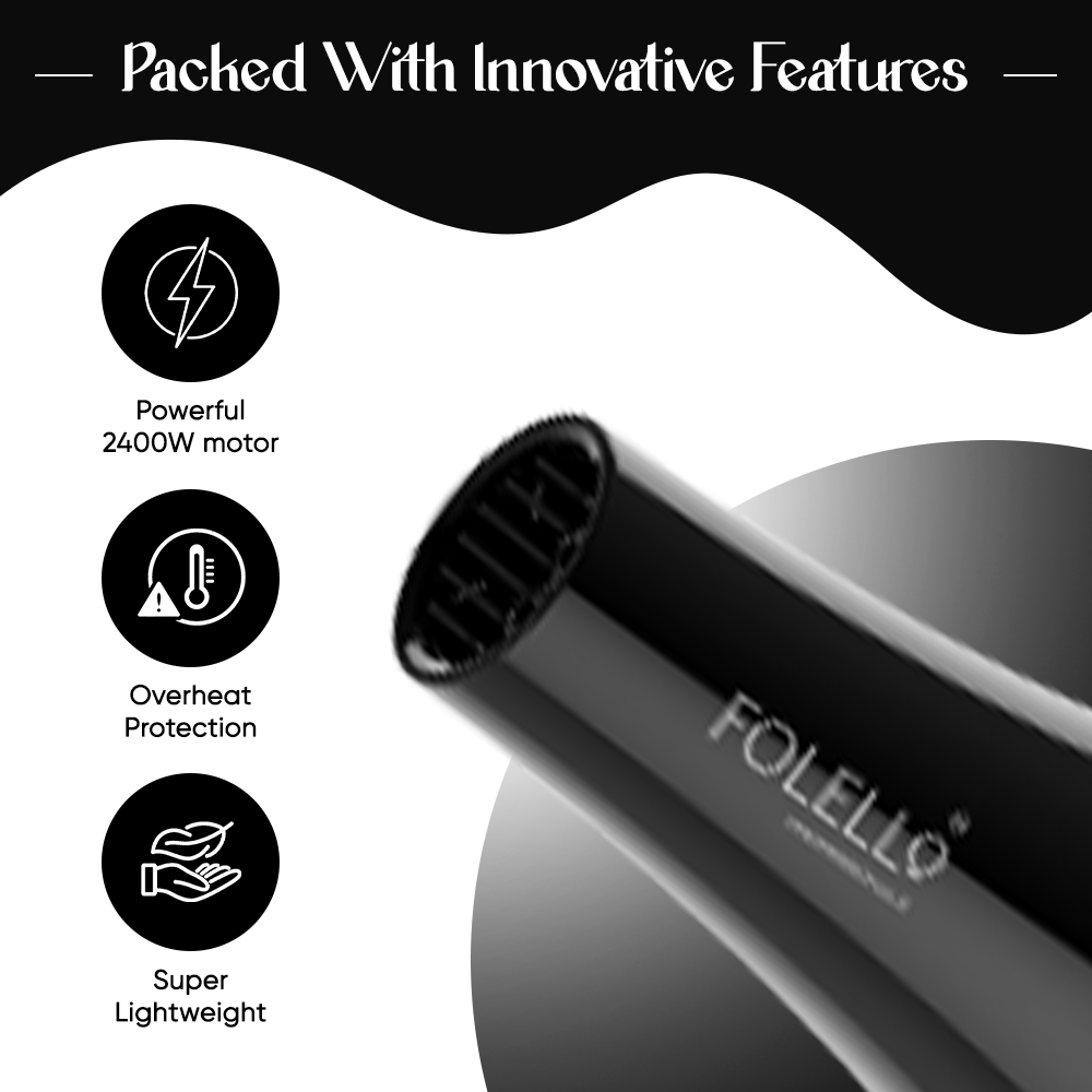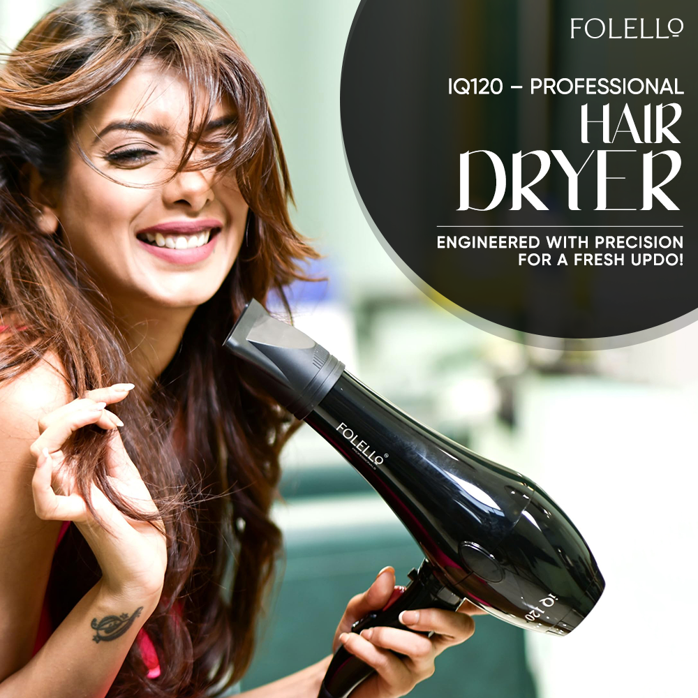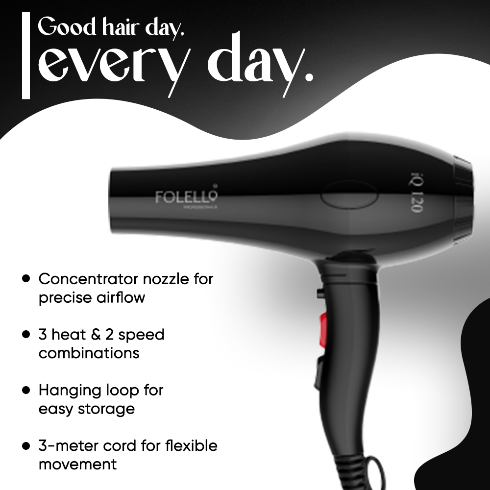 Elevate your hair styling experience with FOLELLO's 'iQ120' Hair Dryer. Discover the perfect balance of power, performance, and convenience, and unlock your hair's true potential. Say hello to effortless styling and goodbye to bad hair days forever. Order yours today!