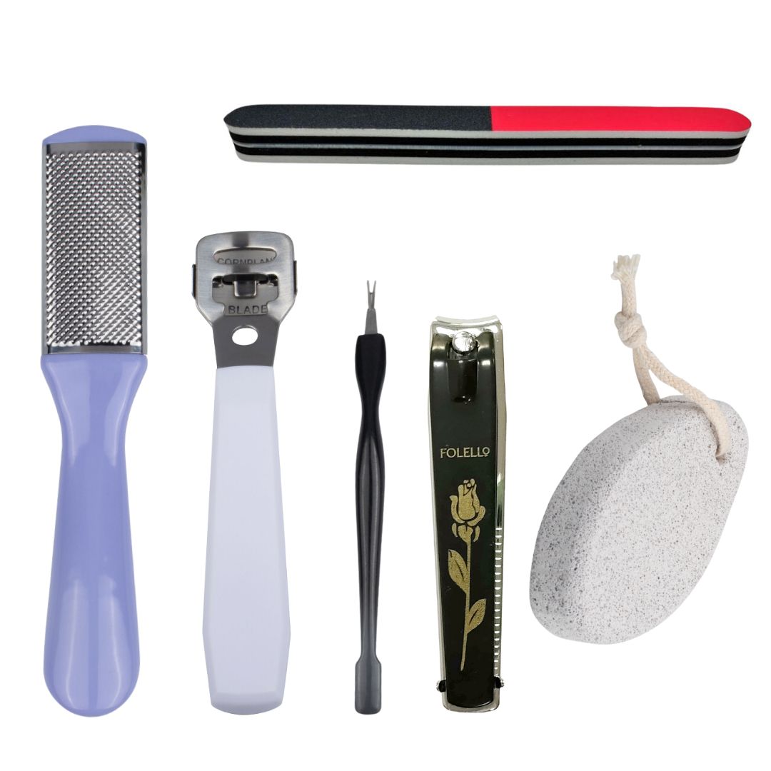 Folello Pedicure Kit: Foot Scrubber, Callus Remover, Cuticle Tool, Nail Cutter, Pumice Stone & Buffer"