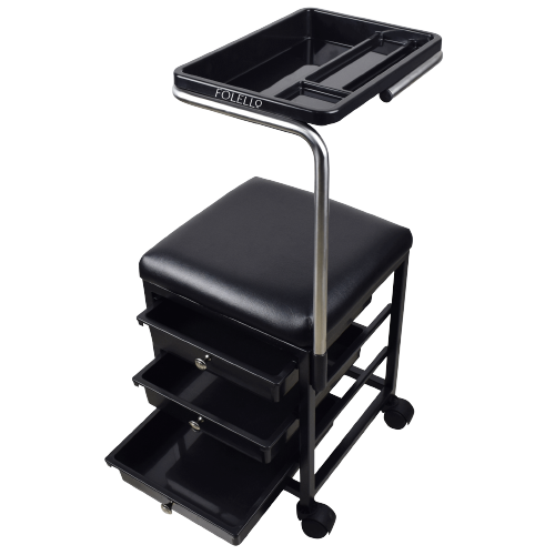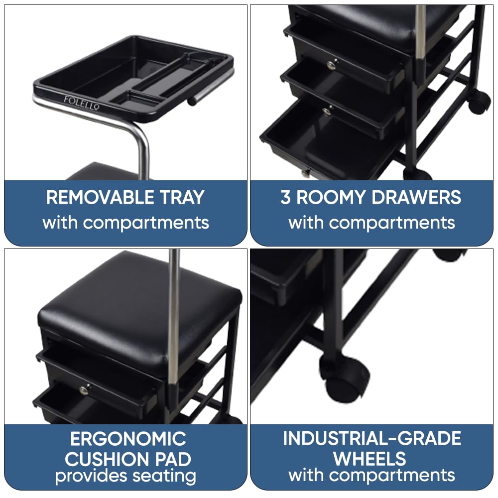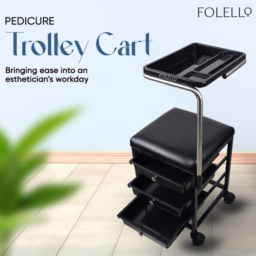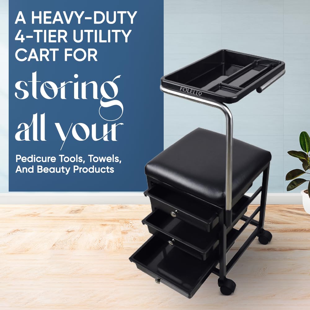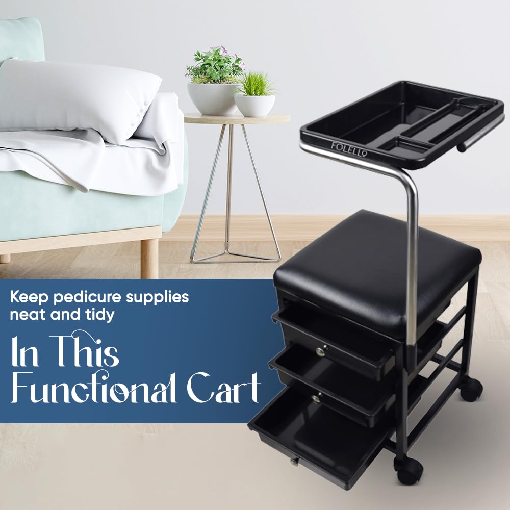 FOLELLO Adjustabele Pedicure Moveable Trolley Cart with Sitting Tool | Removable Accessory Tray with compartments | Handle Knob with Cushion Pads for Comfortable Seating (Black)